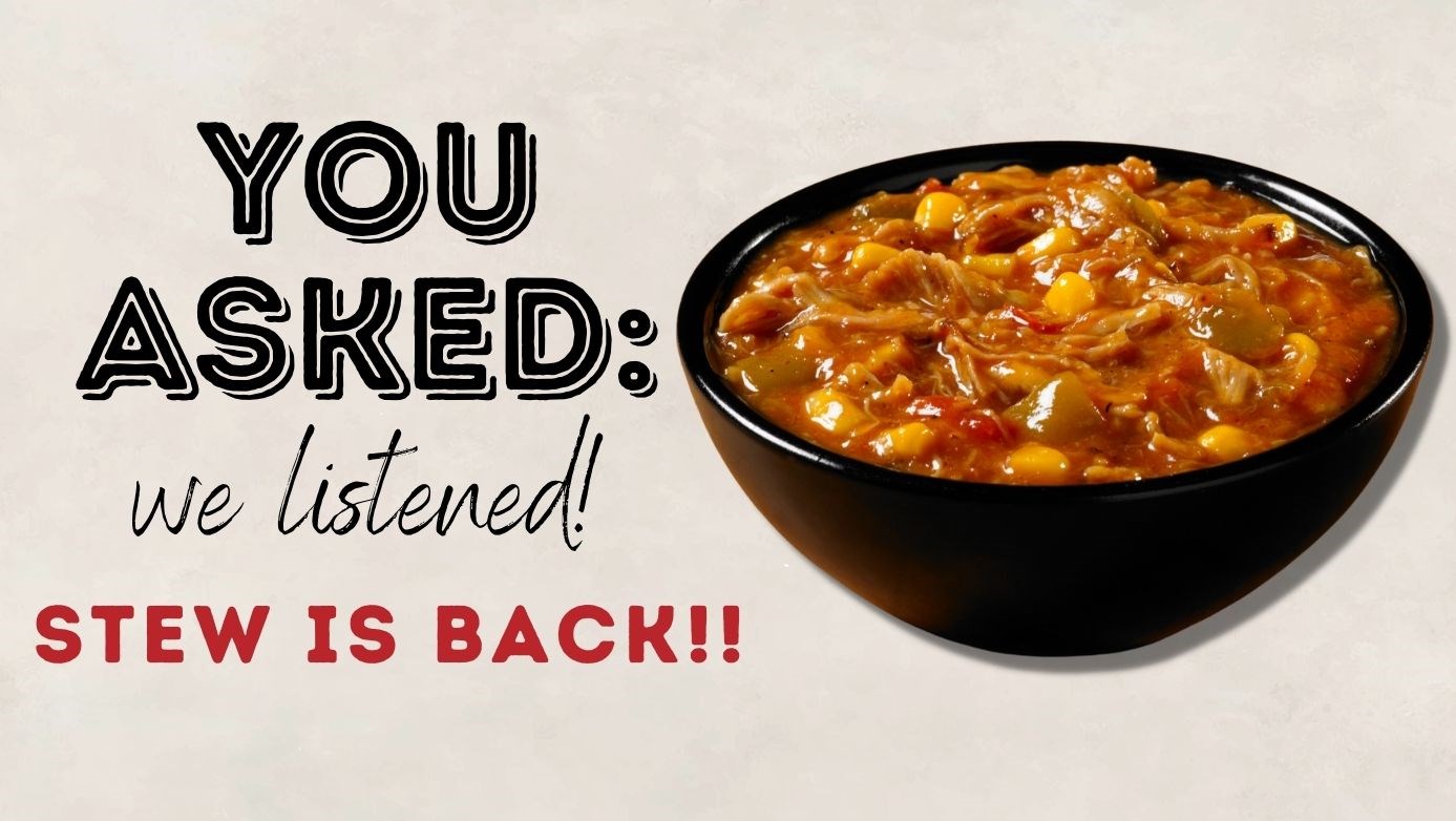 We are ecstatic to be able to add Stew back to our Shack Menus* this month! Thank you to all of our loyal customers for voicing your opinions - it's our pleasure to serve you the delicious Southern food YOU want!